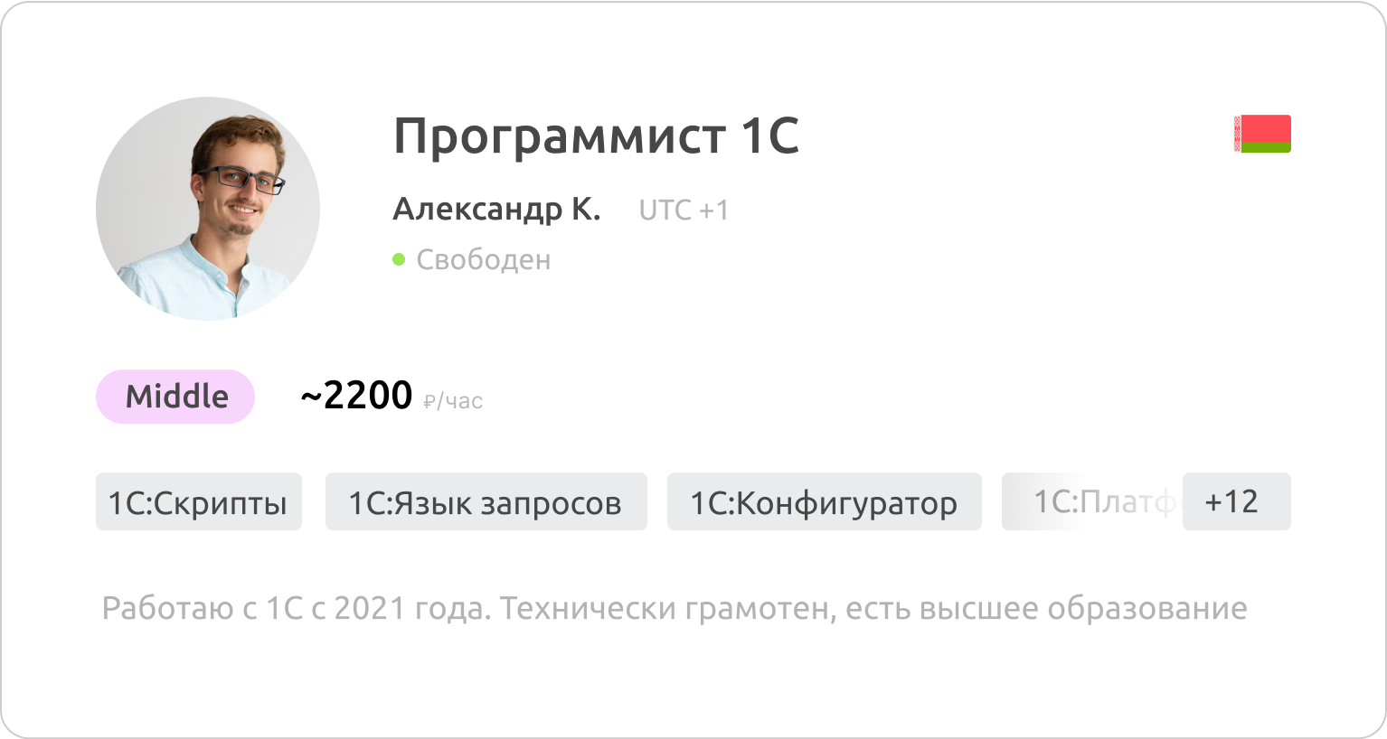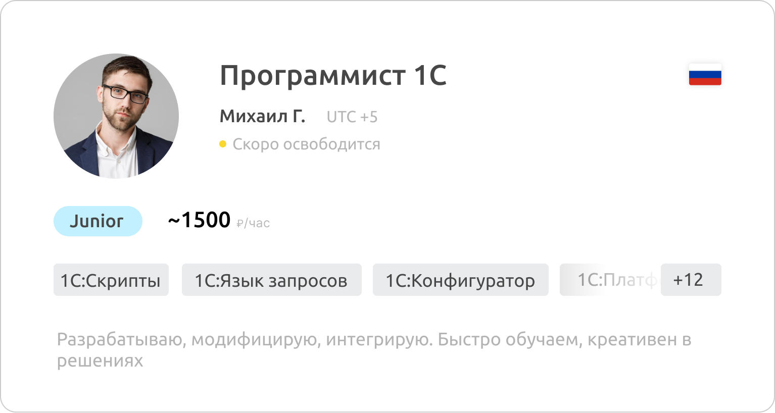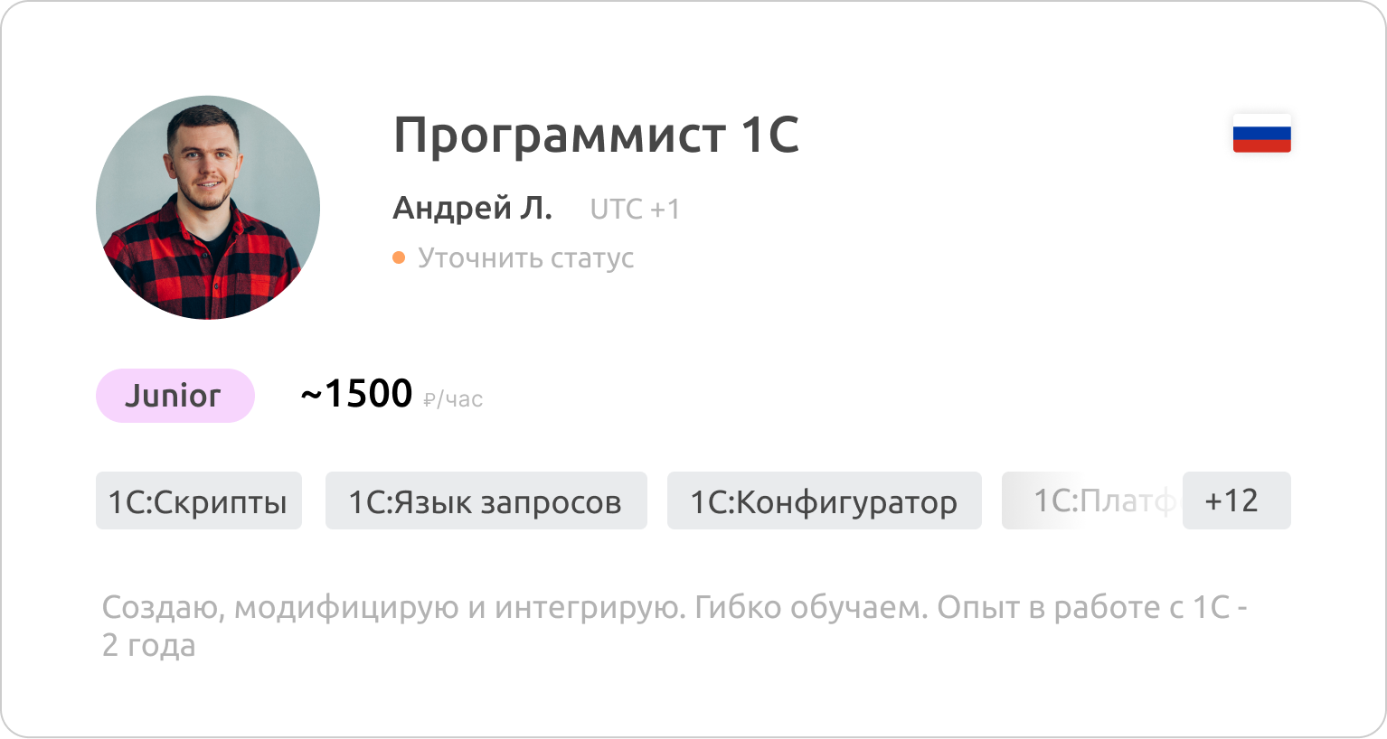 Все специалисты официально трудоустроены у нас в компании или у одного из 400+ наших поставщиков — 1С-франчайзи. Мы гарантируем достоверность указанных данных в резюме кандидатов