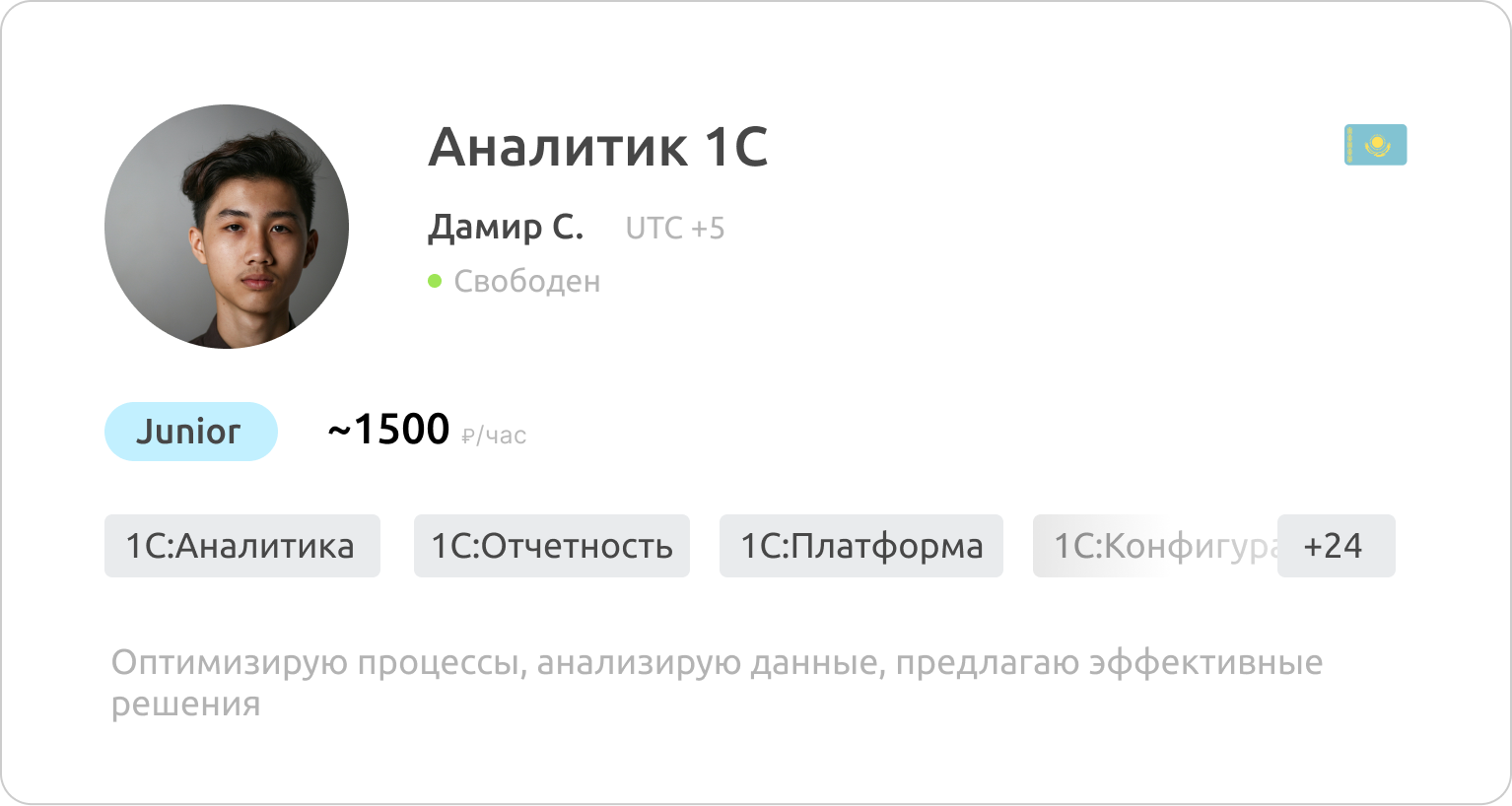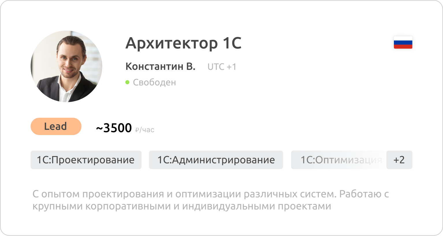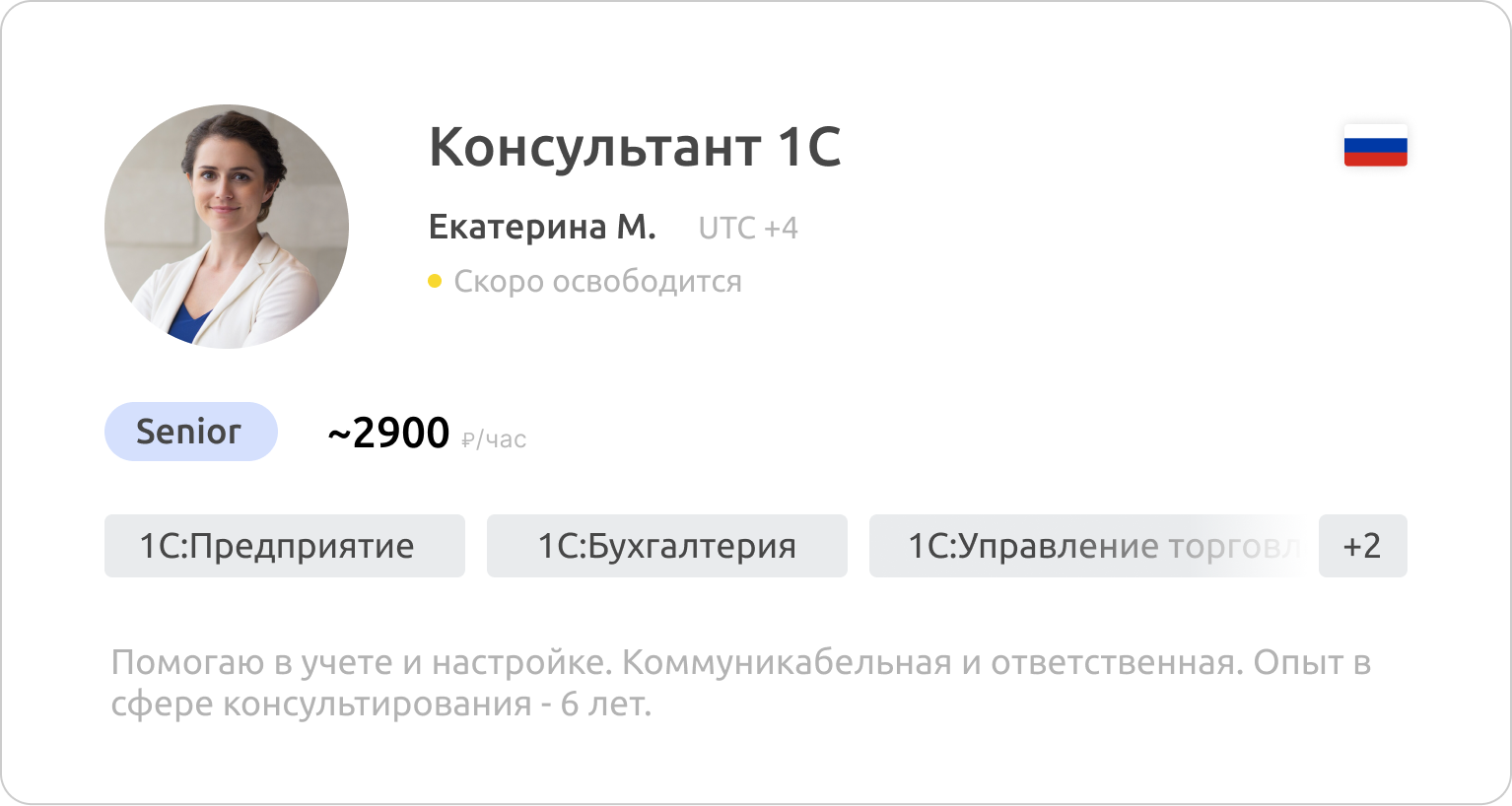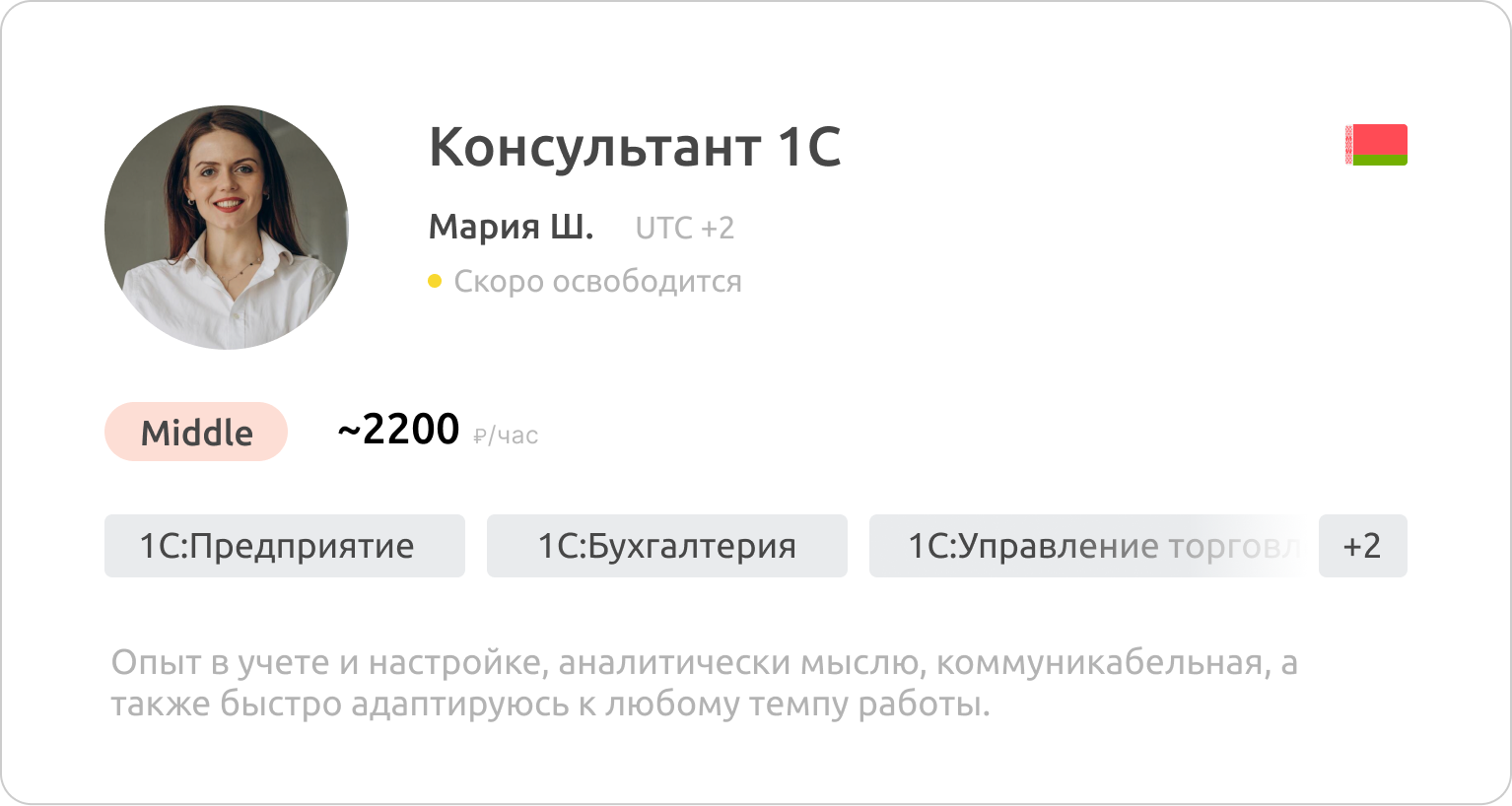 Все специалисты официально трудоустроены у нас в компании или у одного из 400+ наших поставщиков — 1С-франчайзи. Мы гарантируем достоверность указанных данных в резюме кандидатов